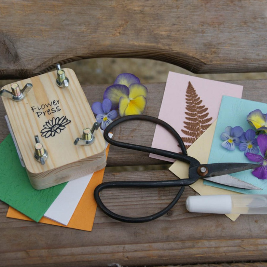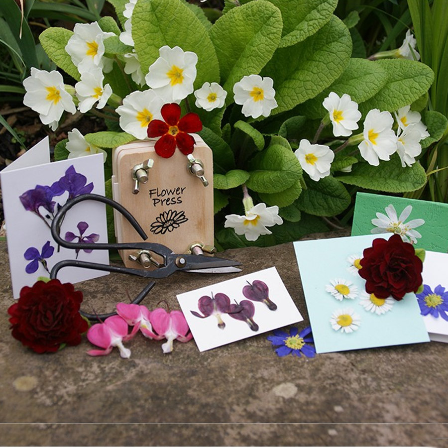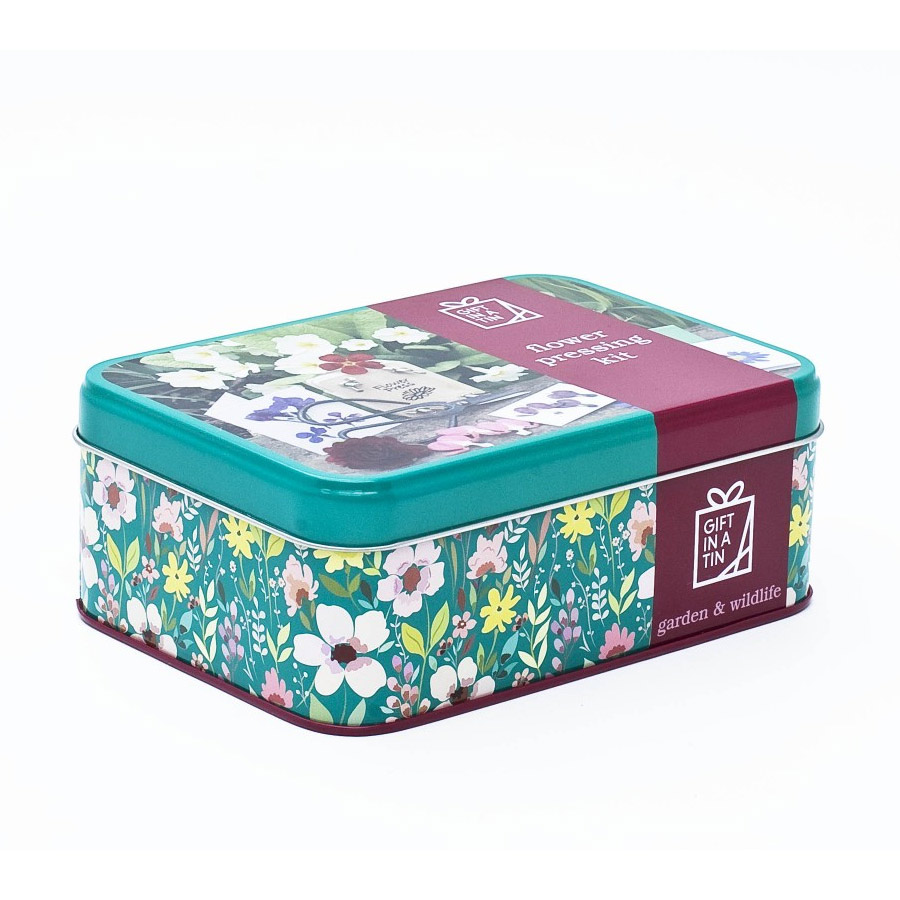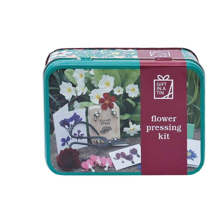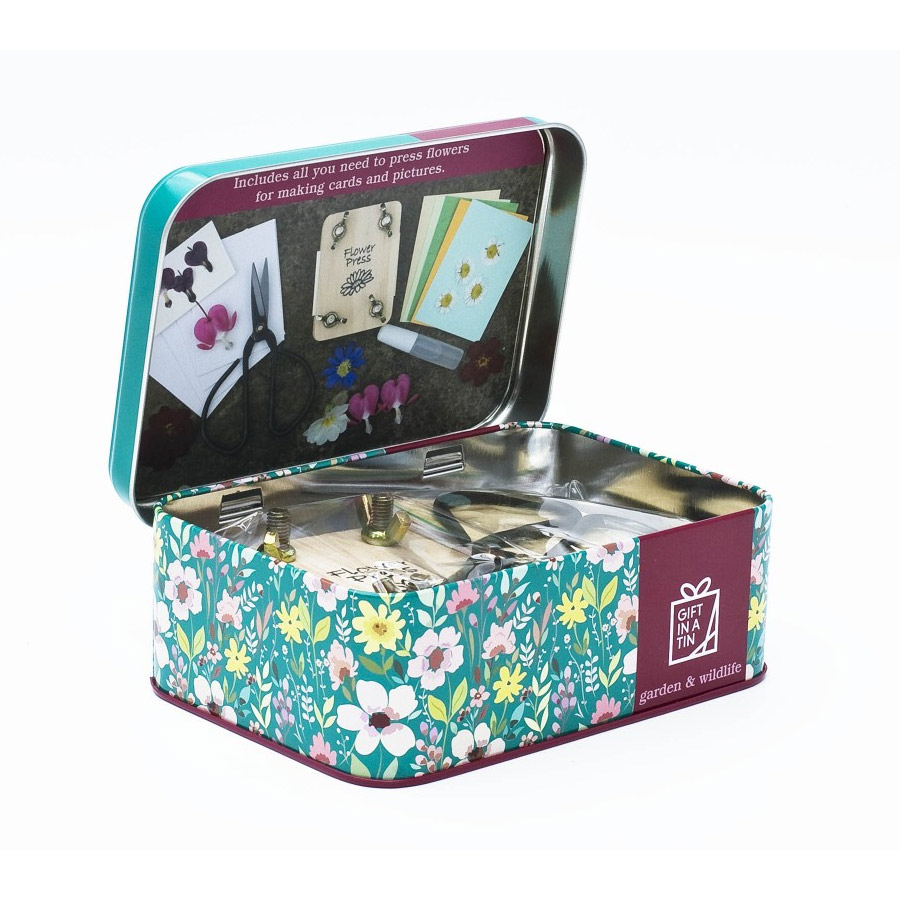 En liten blompress i vacker plåtask. Asken innehåller allt du behöver för att göra fina personliga gratulationskort eller blomtavlor.