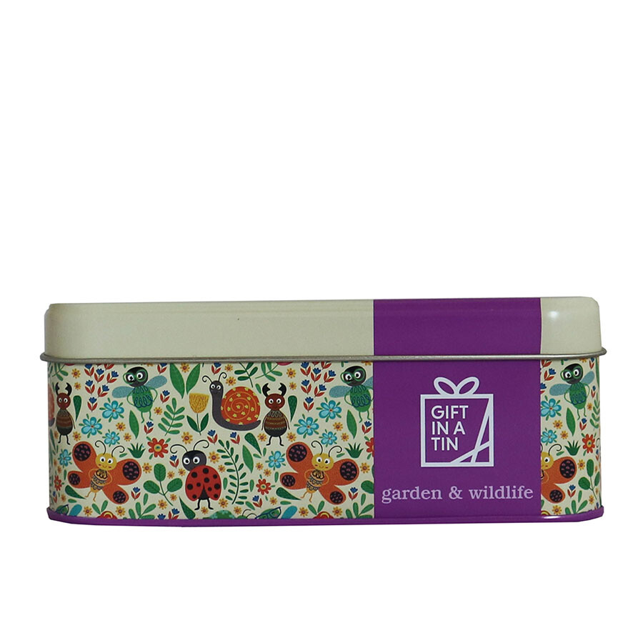 Trädgårdsredskap för de minsta. En fin plåtburk full med roliga trädgårdspyssel och redskap. Barnen kommer att få fullt upp med att gräva, plantera, märka och mycket mer.